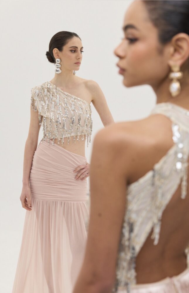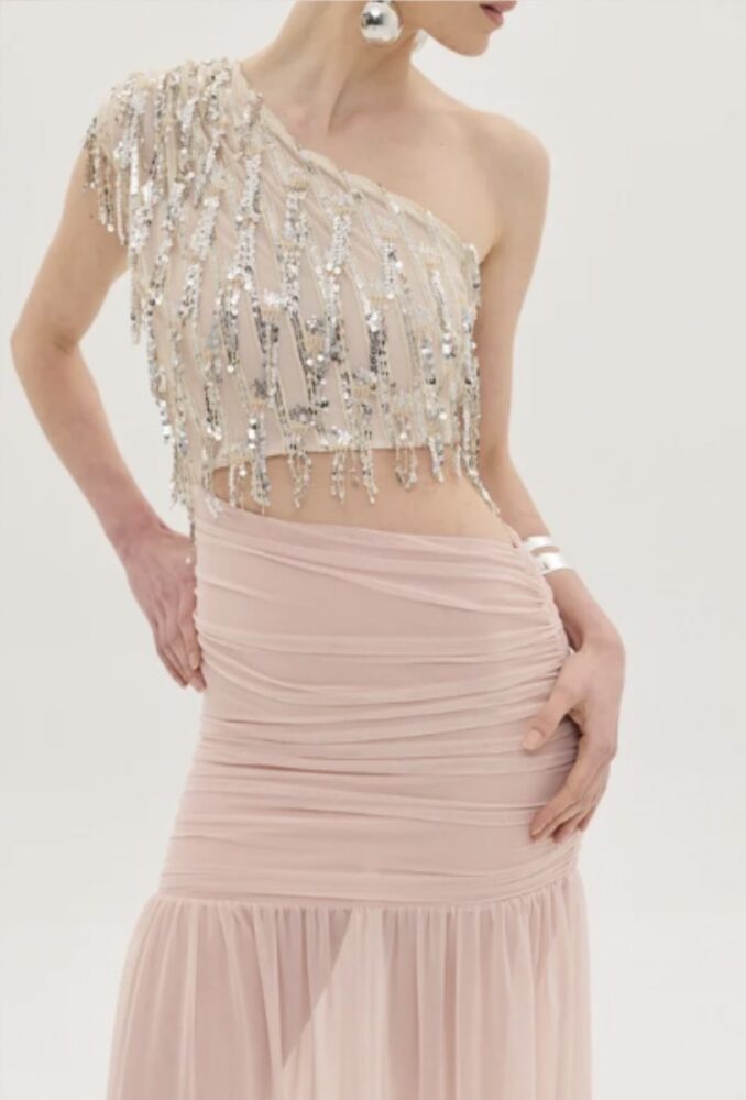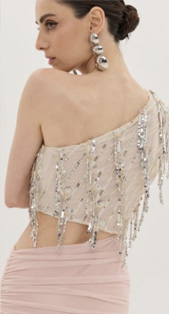 Σαμπανί πάνω μέρος με λωρίδες από ασημί παγιέτες, ραμμένες και κρεμαστές