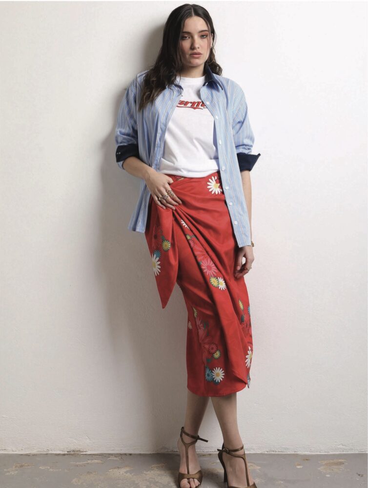 Αυτή η φούστα από λινό ξεχωρίζει χάρη στις απαλές πιέτες και το ευέλικτο μήκος της. Το ανάλαφρο, ρευστό σχέδιο μπορεί να συνδυαστεί με πουκάμισο ή αμάνικο τοπ για ένα κομψό καθημερινό look.