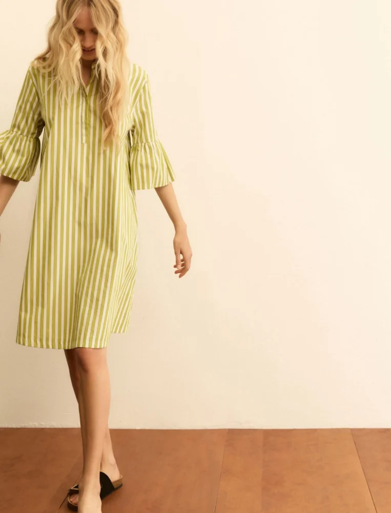 Όταν η θερμοκρασία ανεβαίνει, τα looks γίνονται πιο ανάλαφρα – όπως αυτό το φόρεμα από ποπλίνα, που διαθέτει γιακά τύπου polo για μια ανεπιτήδευτη πινελιά και ρομανικές λεπτομέρειες με βολάν στα μανίκια.
