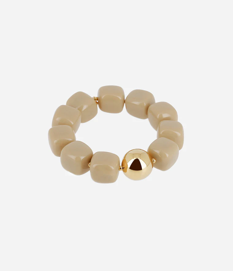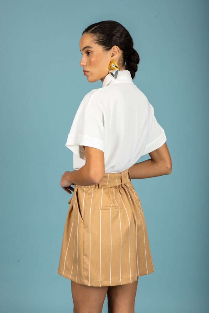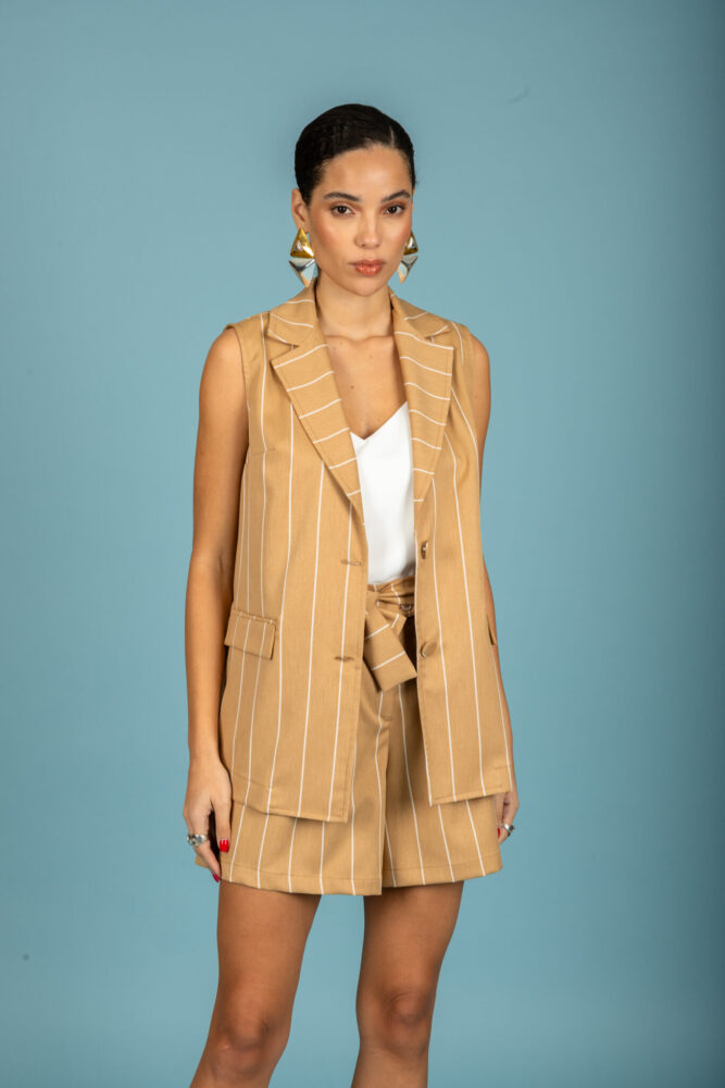 Κλείνει μπροστά με κρυφό φερμουάρ και δύο μπεζ κουμπιά