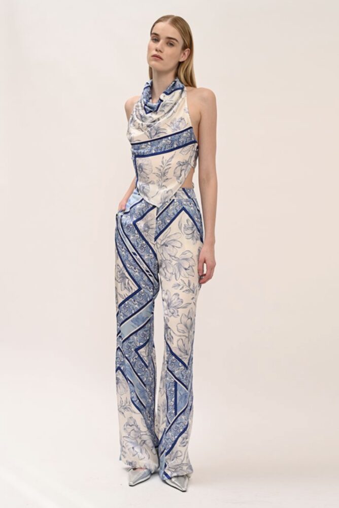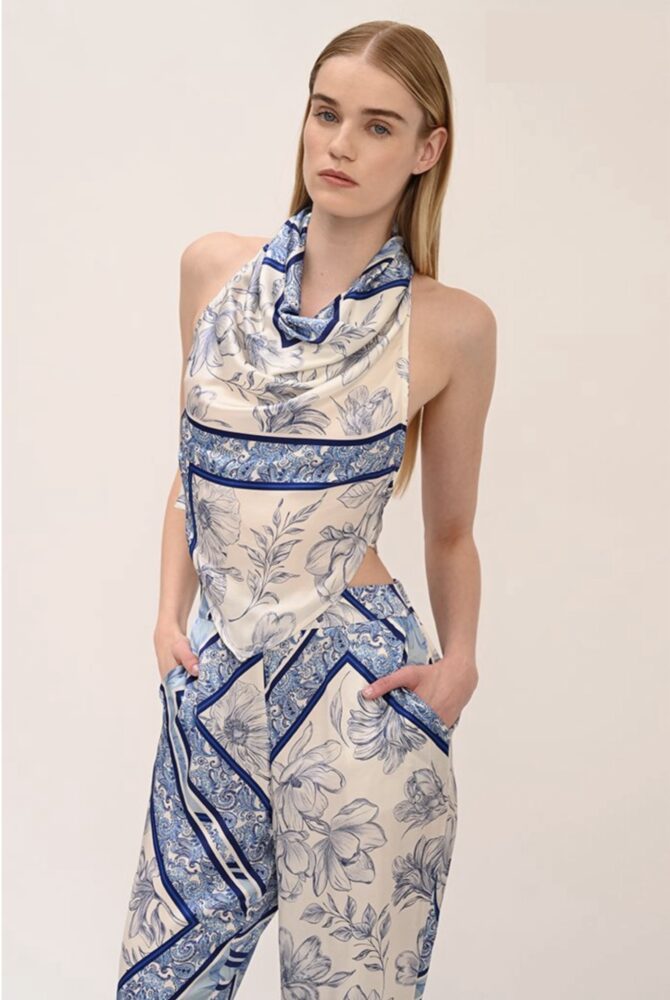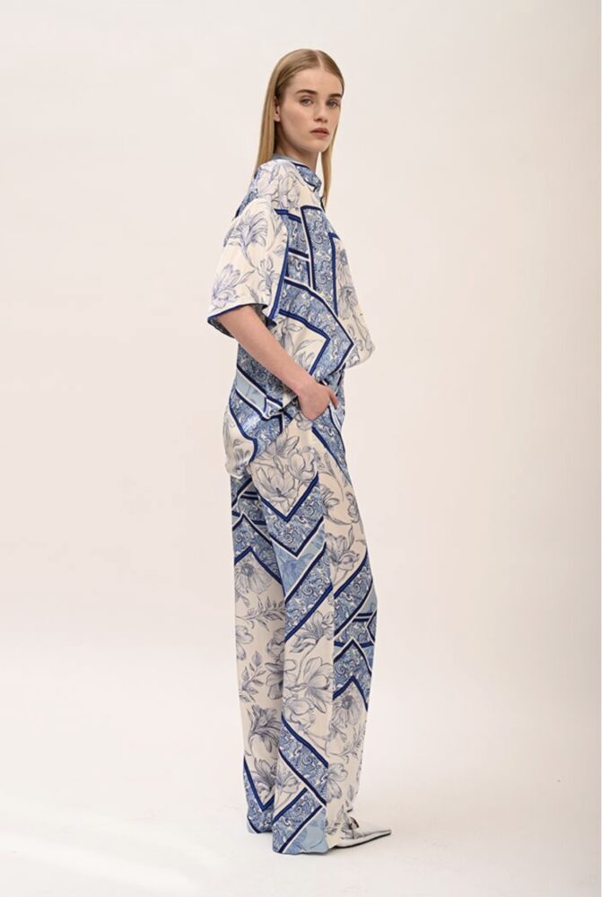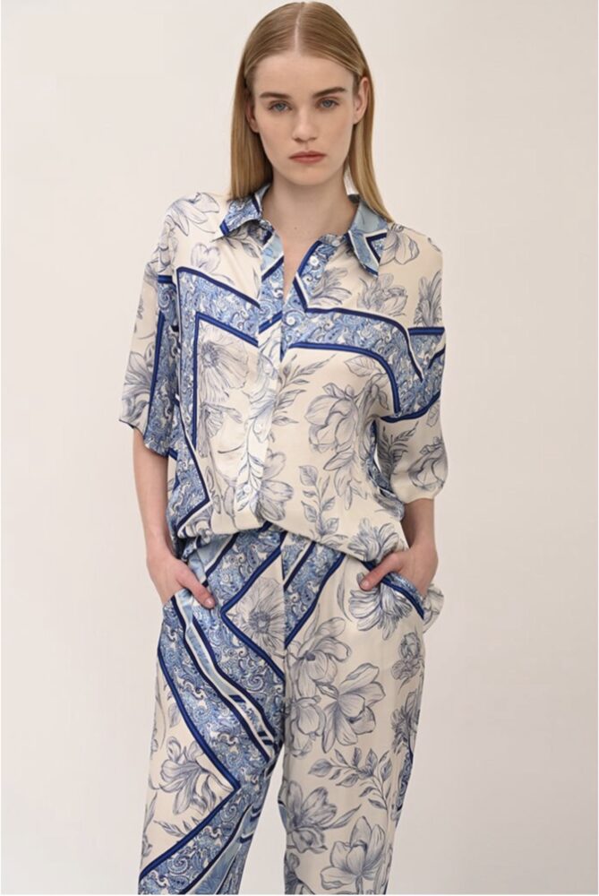 Σκίτσα λουλουδιών και λοξές λωρίδες με λαχούρια, σε αποχρώσεις του μπλε