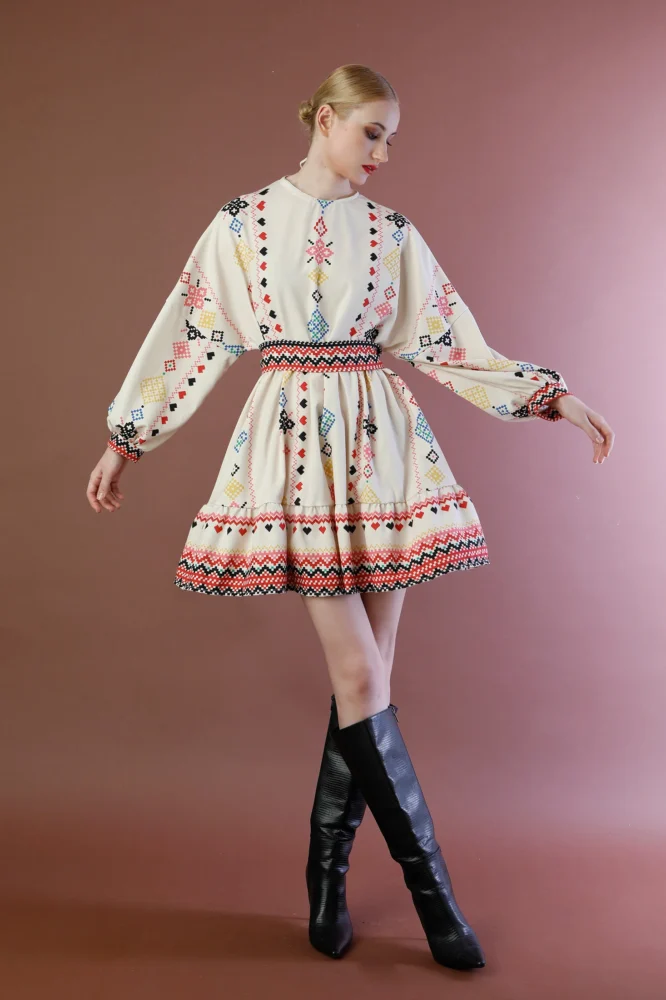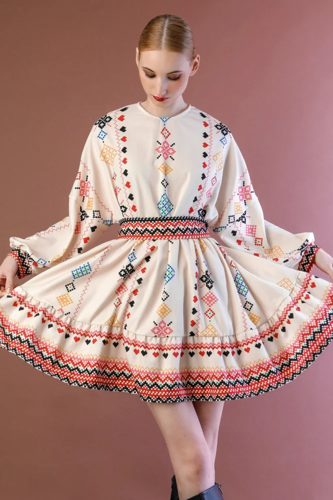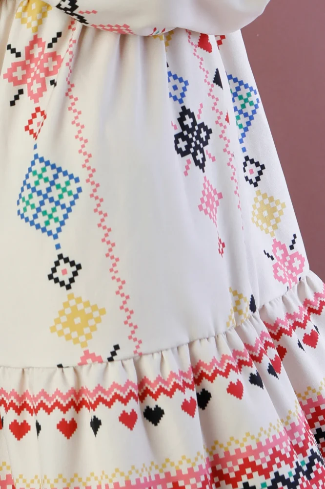 Με χρωματιστά γεωμετρικά μοτίβα και καρδούλες σε όλη την επιφάνεια του φορέματος