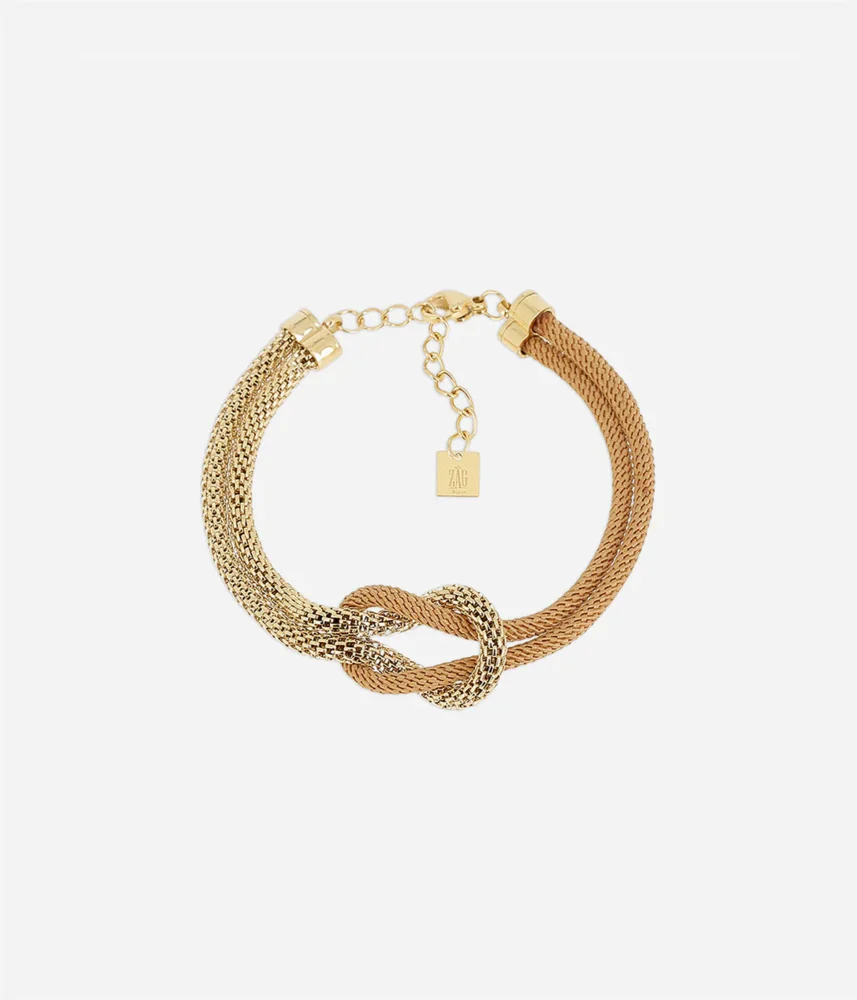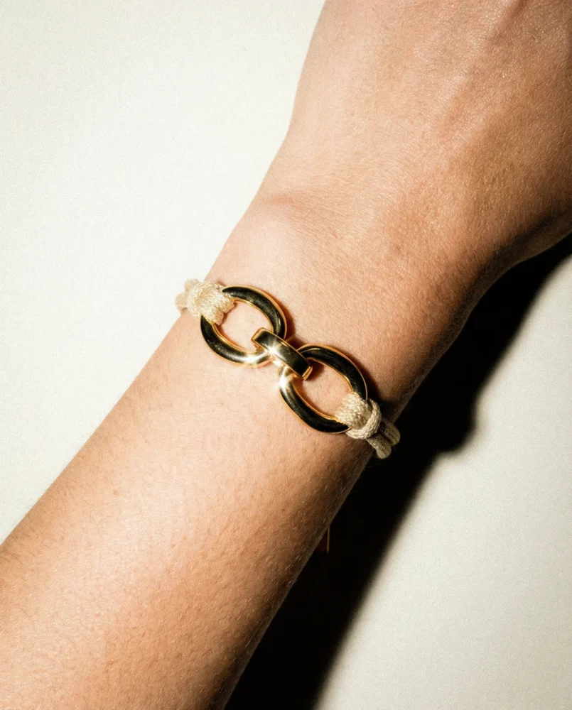 Αυτό το βραχιόλι είναι φτιαγμένο από ανθεκτικό κορδόνι βαμβακιού σε χρώμα καμήλας. Το κούμπωμα είναι από ανοξείδωτο ατσάλι χειρουργικής ποιότητας, με λεπτή επίστρωση χρυσού. Στα άκρα των κορδονιών, δύο οβάλ σχήματα έχουν δεθεί πάνω στα κορδόνια και ενώνονται μεταξύ τους με ξεχωριστό χρυσό κρίκο.