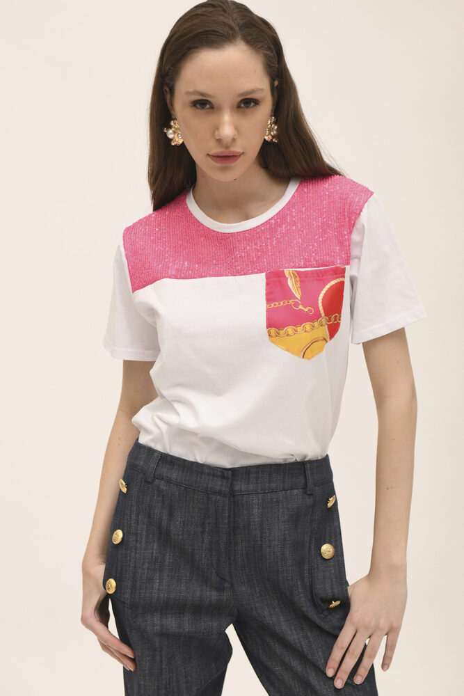 Διαθέτει μεγάλη τσέπη στο ύψος του στήθους με εμπριμέ σχέδιο, σε φούξια και χρυσό χρώμα