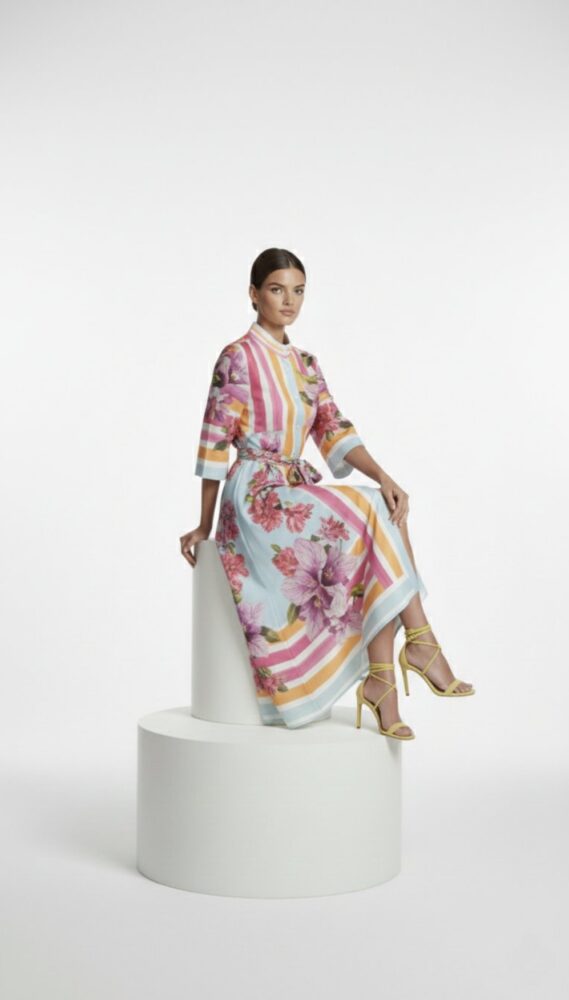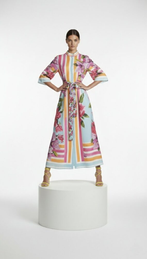 Φόρεμα της εταιρείας Eirianna The Brand με κάθετες ρίγες σε πορτοκαλί, λευκό και φούξια που συνδυάζονται με μεγάλα, τροπικά άνθη σε σιέλ φόντο.